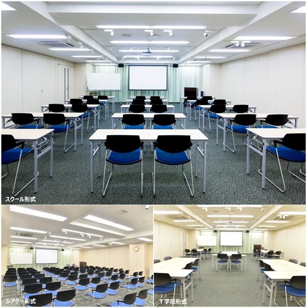 | 収容人数 | スクール 50名 ・ シアター 80名 ・ ロの字 28名 ・ コの字 24名 ・ T字島 36名 ・ 島 24名 |